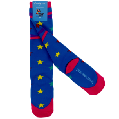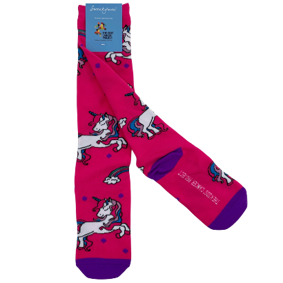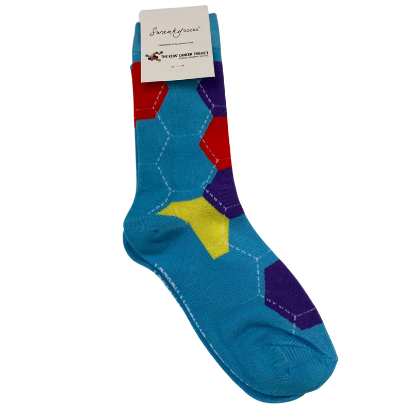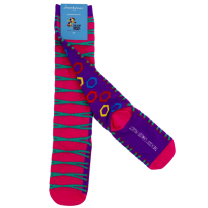 Strut down the street in these eye-catching hot pink, knee-length socks featuring turquoise laces on the front and multi-coloured hexagons on the back.